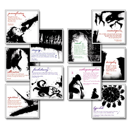 OnSale Literary Techniques Educational Poster Series. Eco-friendly, English Literature Art Prints. Featuring: Alliteration, Anthropomorphism, Personification, Hyperbole, Repetition, Onomatopoeia, Simile, Imagery